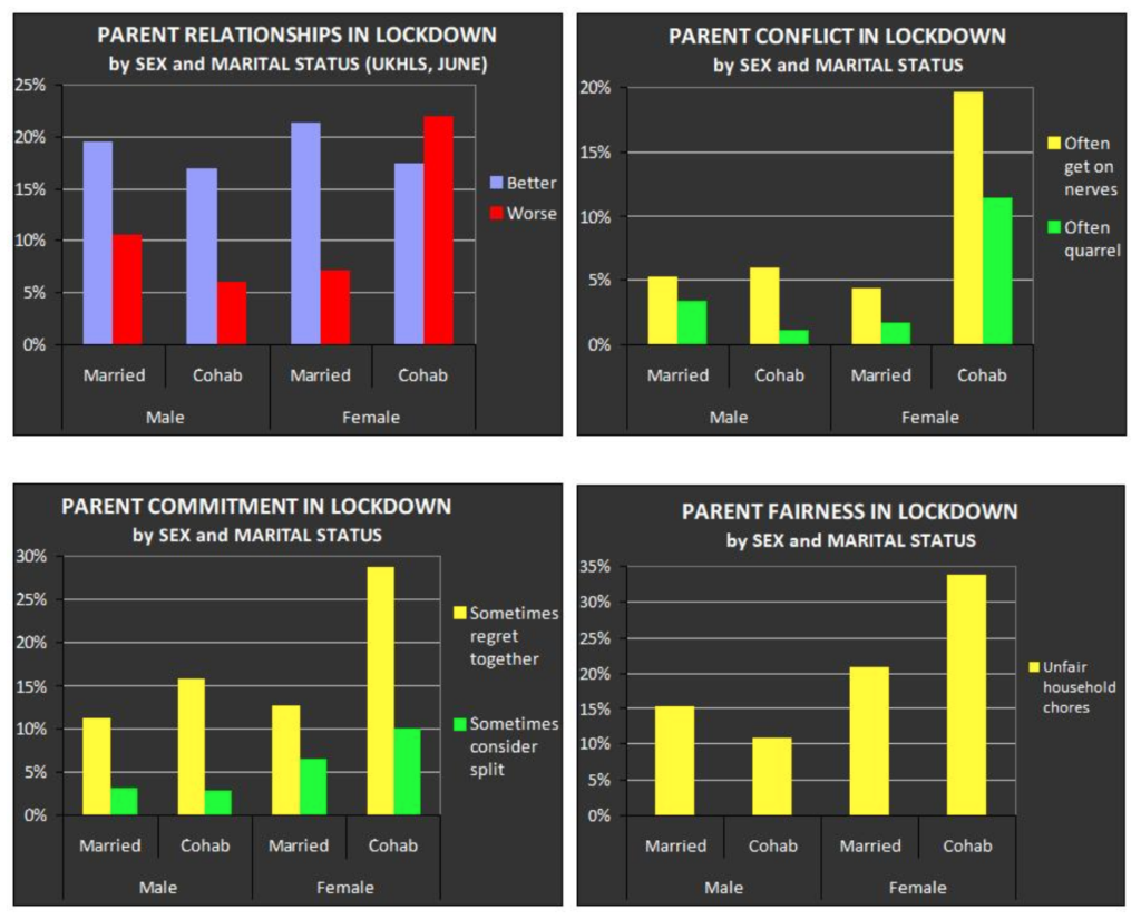 This is where the gender difference comes in. In married relationships both men and women have both bought in to the same plan of a lifetime together. So we wouldn’t expect to see much of a gender difference in how married parents viewed lockdown. However in cohabiting relationships, it tends to be men who are the less committed ones. It’s not always the men who are the less committed ones, but mostly. And it doesn’t apply to all cohabiting men, obviously. A minority of cohabiting parents do perfectly well and look to all intents and purposes like the majority of married parents.
